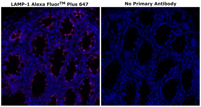 Description: The eBioH4A3 monoclonal antibody reacts with human CD107a, also known as lysosomal-associated membrane protein-1 (LAMP-1). CD107a is a highly glycosylated protein of approximately 110kDa. It is predominantly expressed intracellularly in the lysosomal/endosomal membrane in nearly all cells. CD107a is transiently expressed on the cell surface of degranulating cytolytic T cells, and is also upregulated on the surface of activated platelets and some cancer cells. Applications Reported: Purified anti-human CD107a (LAMP-1) has been reported for use in flow cytometric analysis, immunohistochemistry, immunocytochemistry, and immunoblotting. It has also been reported for use in surface staining in a flow cytometric based degranulation assay. (Fluorochrome conjugated eBioH4B4 (H4B4) is recommended for use in flow cytometry). Applications Tested: This eBioH4A3 antibody has been tested by immunohistochemistry on formalin-fixed paraffin embedded human tissue using low pH antigen retrieval and can be used at 10 μg/mL. It is recommended that the antibody be carefully titrated for optimal performance in the assay of interest. Using conjugate solutions: Centrifuge the protein conjugate solution briefly in a microcentrifuge before use; add only the supernatant to the experiment. This step will help eliminate any protein aggregates that may have formed during storage, thereby reducing nonspecific background staining.