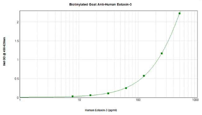 AA Sequence of recombinant protein: TRGSDISKTC CFQYSHKPLP WTWVRSYEFT SNSCSQRAVI FTTKRGKKVC THPRKKWVQK YISLLKTPKQ L. Preparation: Produced from sera of goats immunized with highly pure Recombinant Human Eotaxin-3 (CCL26). Anti-hEotaxin-3 (CCL26)-specific antibody was purified by affinity chromatography and then biotinylated. Sandwich ELISA: To detect hEotaxin-3 by sandwich ELISA (using 100 μL/well antibody solution) a concentration of 0.25-1.0 μg/mL of this antibody is required. This biotinylated polyclonal antibody, in conjunction with PeproTech Polyclonal Anti-Human Eotaxin-3 (500-P156G) as a capture antibody, allows the detection of at least 0.2-0.4 ng/well of Recombinant hEotaxin-3. Western Blot: To detect hEotaxin-3 by Western Blot analysis this antibody can be used at a concentration of 0.1-0.2 μg/mL. Used in conjunction with compatible secondary reagents the detection limit for Recombinant hEotaxin-3 is 1.5-3.0 ng/lane, under either reducing or non-reducing conditions. 500-P156GBT-1MG will be provided as 2 x 500 μg