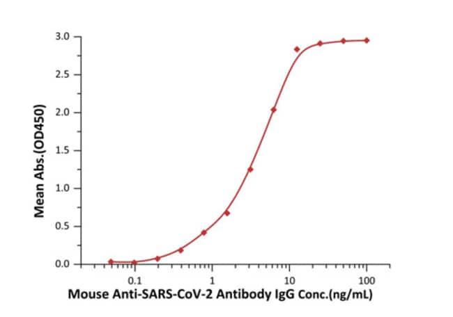 Immobilized SARS-CoV-2 Spike RBD at 2 g/mL (100 L/well) can bind Mouse Anti-SARS-CoV-2 Antibody IgG in mouse serum. Detection was performed using HRP-Conjugated Anti-mouse IgG secondary antibody with sensitivity of 20 ng/mL (QC tested).