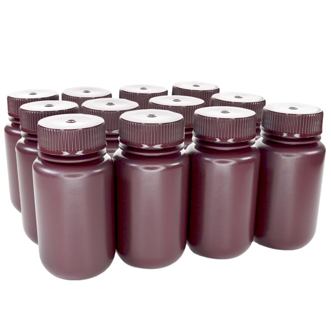 Pack of 12 sterile wide-mouth amber HDPE reagent bottles with polypropylene caps areUV-protective, leak-tested, and chemically resistant, ideal for safe storage and transfer of light-sensitive liquids in lab and industrial settings.