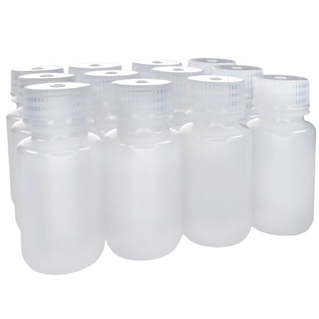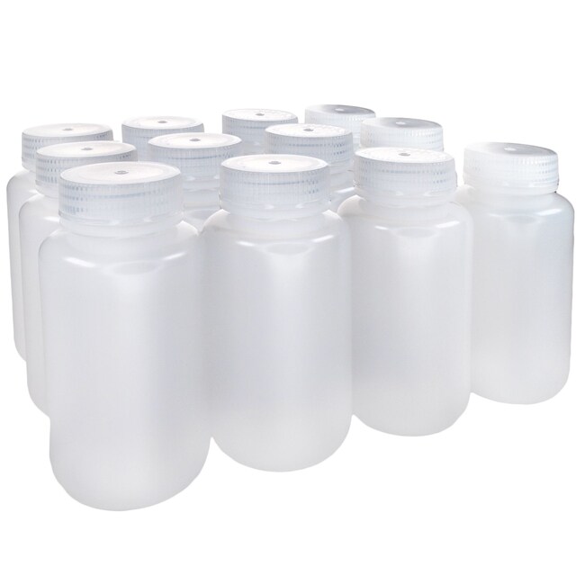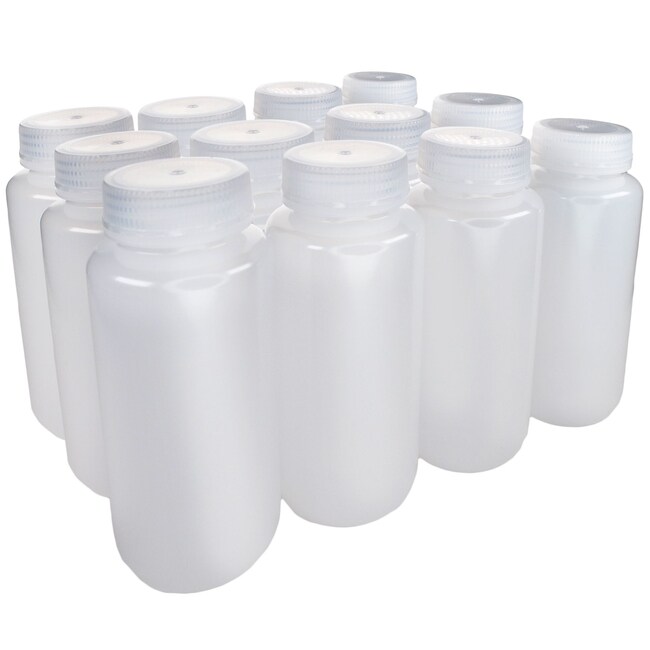 Pack of 12 wide-mouth LDPE reagent bottles with polypropylene caps are non-sterile, leak-tested, and chemically resistant for safe, easy handling and storage of lab liquids in research and industrial settings.