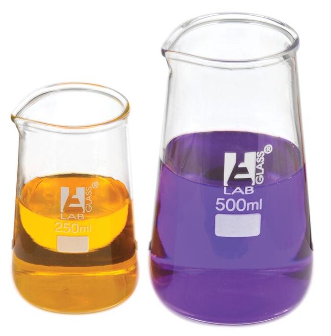 These Phillip Pattern beakers have a conical form and are made by hand from high quality borosilicate 3.3 glass. They are extremely durable, have a low temperature gradient, and superior chemical durability, and include a spout for easy pouring. Autoclavable.