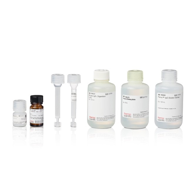 | Content And Storage | Sufficient For: 10 antibody samples, each containing 0.25 to 4 mg IgG • Pierce Ficin Agarose, 2.5 mL • Cysteine-HCl, 1 g • Mouse IgG1 Digestion Buffer, 120 mL • NAb Protein A Plus Spin Column, 1 mL, 1 column • Protein A Binding Buffer, 120 mL • IgG Elution Buffer, 120 mL • Zeba Desalt Spin Columns, 7K MWCO, 2 mL, 10 columns • Spin Columns, 0.8 mL, 10 columns • Microcentrifuge tubes, 2 mL, 30 tubes Store at 4–8°C. |