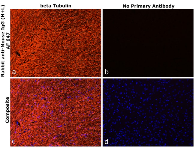 Rabbit anti-Mouse IgG (H+L) Superclonal™ Recombinant Secondary Antibody, Alexa Fluor™ 647 can detect both Fab2 and Fc region of Mouse IgG. It can also detect all subtypes of Mouse IgG (Mouse IgG1,2a,2b and 3). It has <20% cross reactivity to Human IgG and Rat IgM. It showed minimum to no cross-reactivity to various species immunoglobulins tested. This recombinant antibody has been engineered with point mutations that eliminate binding to Fc receptors, enabling reduction in background and superior signal to noise. Superclonal™ recombinant secondary antibodies are produced using a multifaceted clonal selection process that involves several phenotypic screens to ensure enhanced specificity, animal origin free formulation and lot-to-lot consistency. Protein conjugates made with Alexa Fluor™ dyes produce fluorescence output that surpasses that of other spectrally similar fluorophore-labeled proteins. Alexa Fluor™ dyes are available in a wide selection of fluorescent colors and are more photostable than most other dyes. Photostability is a key characteristic of Alexa Fluor dye™ conjugates, allowing more time for image capture. In addition to their exceptional brightness and the wide selection of dyes across the spectrum, you'll get photostability you can rely on with Alexa Fluor™ dyes and dye conjugates. It is recommended that the antibody be carefully titrated for optimal performance in the assay of interest.