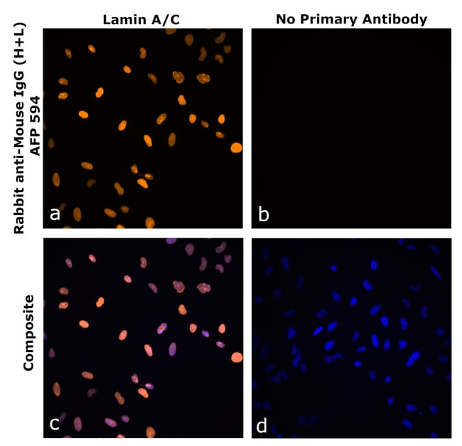 Rabbit anti-Mouse IgG (H+L) Superclonal™ Recombinant Secondary Antibody, Alexa Fluor™ Plus 594 can detect both Fab2 and Fc region of Mouse IgG. It can also detect all subtypes of Mouse IgG (Mouse IgG1,2a,2b and 3). It has <20% cross reactivity to Human IgG and Rat IgM. It showed minimum to no cross-reactivity to various species immunoglobulins tested. This recombinant antibody has been engineered with point mutations that eliminate binding to Fc receptors, enabling reduction in background and superior signal to noise. Superclonal™ recombinant secondary antibodies are produced using a multifaceted clonal selection process that involves several phenotypic screens to ensure enhanced specificity, animal origin free formulation and lot-to-lot consistency. Alexa Fluor™ Plus dyes have been chemically optimized to provide higher signal to noise ratios and minimized cross-reactivity to help detect low-abundance targets in rare or precious samples. It is recommended that the antibody be carefully titrated for optimal performance in the assay of interest.