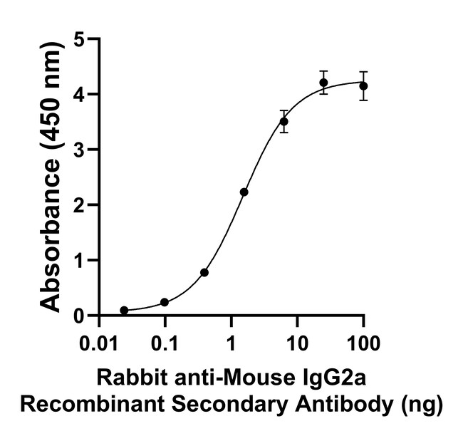 The Rabbit anti-Mouse IgG2a Recombinant Secondary Antibody is specific to Mouse IgG2a with no reactivity towards Mouse IgG1, Mouse IgG2b or Mouse IgG3. It showed no cross-reactivity to various species immunoglobulins tested. This recombinant antibody has been engineered with point mutations that eliminate binding to Fc receptors, enabling reduction in background and superior signal to noise. The sensitivity and specificity of each lot is confirmed using ELISA. It is recommended that the antibody be carefully titrated for optimal performance in the assay of interest.