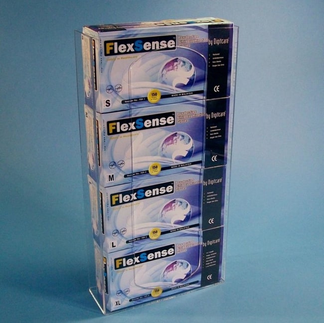 Dispensers are constructed of 1/8 in. clear PETG, with one large compartment to keep multiple boxes of exam gloves neat and organized.